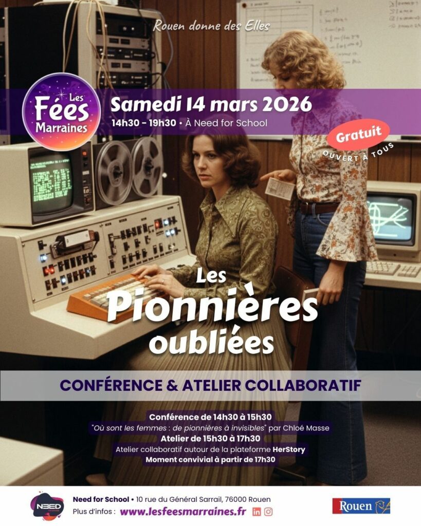 👉 14h30 – Conférence “De pionnières à oubliées : où sont passées les femmes dans l’informatique ?” par Chloé Masse, développeuse full stack et Fée Marraine.